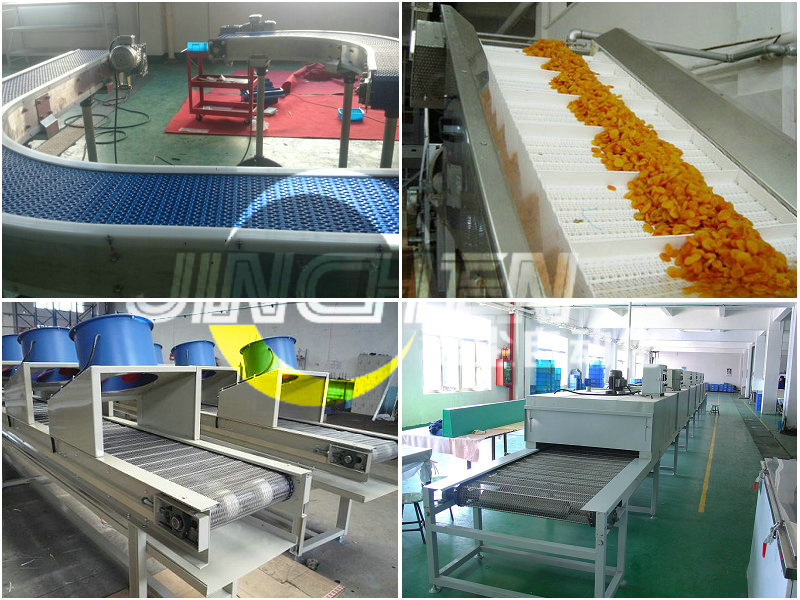 使用金屬或模塊網帶,采用鏈輪驅動,不易蛇行、跑偏,根據產品特性選擇網帶材質,可增加加熱.清洗.殺菌等配套。