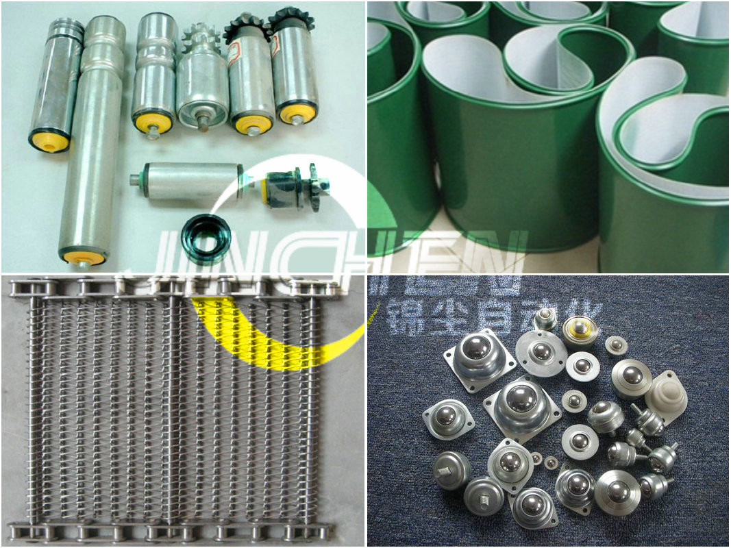 輸送機配件包括皮帶、滾筒、網帶和萬向球等。